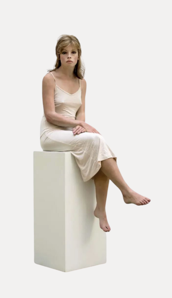 Tara, 2017 Bronze with a polychrome patina, acrylic hair, hairs and cloth, Corian base. 159 x 40,8 x 86 cm